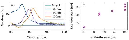Au thicknesses in the range 5 nm to 100 nm were investigated, both on tapered and untapered coreless fibers. However, the resonance peak of the 5 nm films was ambiguous and, as such, will not be included in the analysis. The resonance wavelength materialized as a distinct absorption peak in the spectrum and was found by immersion in water with air as a reference (in Equation (2)). The water absorption is less than 0.1 mm −1 for the wavelengths in question and the contribution to the measured absorbance is therefore negligible. Representative samples of the absorbance in water and, thereby, the absorption due to the Au film is shown in Figure 4a for Au films with thickness 20 nm, 50 nm, and 100 nm on both tapered and untapered fibers. An example of water measured on an uncoated fiber is also included for reference. There was no significant difference between the peak position on untapered and tapered fibers. The difference in the intensity of the absorption peaks of the Au films in Figure 4a is representative of experimental variation between samples. The average peak absorption wavelength for a given coated fiber as a function of thickness is plotted in Figure 4b. For some Au thicknesses, several fibers were manufactured, showing some variance in the resonance peak with the same protocol. Across all samples, the peak absorption wavelength increased with increasing film thickness.