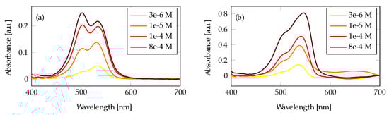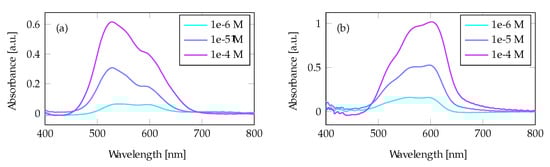 The absorbance of Rhodamine 6G (R6G) measured from the tapered fibers without any Au layer is shown in Figure 5a. We first see an increase in the 530 nm absorption peak until a high concentration of over 1 × 10−4 mol/L is reached. This peak corresponds to the R6G monomer []. For concentrations above 1 × 10−4 mol/L, the second peak around 500 nm starts to dominate, which corresponds with the dimer peak. Figure 5b shows the absorbance in the presence of a 100 Au film on the tapered fiber: when compared to the uncoated tapered fiber, the absorbance has increased three times. Here, the monomer peak around 530 nm absorbs much more than the dimer peak at 500 nm, even at the highest concentration.