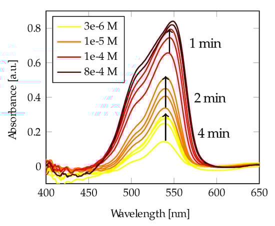 The measurements shown in Figure 5a were taken immediately after sample application. However, the absorbance increased with time after the sample application and stabilized after 4 min, shown in Figure 6. This is due to the adsorption kinetics: it takes some time to achieve an equilibrium between the molecules in solution and the molecules adsorbed to the surface. The increase is most substantial for the lower concentrations, and the 8 × 10−4mol/L only absorbed slightly more with time. This observation corresponds to what we expect from adsorption kinetics: saturation of molecules on the surface is reached faster with a high concentration [] than a low one. The increase in absorbance with time was much more dominant at the Au surface than on the fiber without the Au film. This effect confirms that there is an interaction between the surface and the molecules.