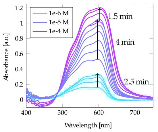 In line with the measurements of R6G, the CV absorbance also increased with time after application to the Au-coated fiber probe. The enhanced absorption as a function of time is seen in Figure 8. The absorbance increased by about a twofold, and the same pattern emerges as seen with R6G: the absorbance increases slightly with time until stabilization. The time varied from 1.5 to 4 min across different sample concentrations. The highest concentration (1 × 10−4 mol/L) stabilized faster than the other solutions. However, there was not a linear relationship between stabilization time and concentration. The most substantial increase in the signal over time was found for concentrations in the middle of the investigated concentration range, from 5 × 10−6 mol/L to 1 × 10−5 mol/L. (The same tendency was also observed for R6G but not as strongly.)