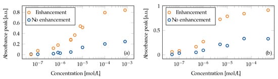 A summary of the peak absorbance of several R6G concentrations after stabilization is shown in Figure 9a for tapers with and without the 100 nm Au film. There is an increase in all concentrations except for 5 × 10−8 mol/L, but the enhancement is nonlinear, as expected from adsorption isotherms that describe the molecular adsorption. For high concentrations, saturation leads to a flattening curve. The highest increase is seen for concentrations 5 × 10−6 mol/L to 5 × 10−5 mol/L.