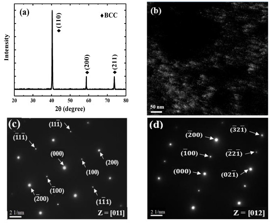 (a) XRD patterns of TiAlV LD-MEA; (b) TEM dark-field image; (c) and (d) corresponding SAED patterns.