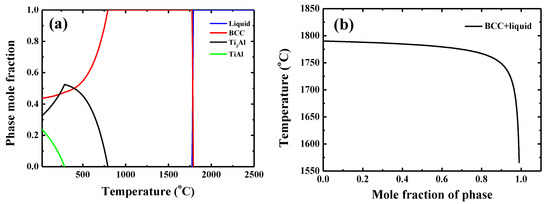 For the equilibrium phase diagram, although three phases, BCC, Ti3Al, and TiAl, were predicted, and the experiment observation shows that the BCC and B2 phase formed in the as-cast TiAlV. Additionally, the equilibrium phase diagram can be used to predict the phase formation in MPEA. Gao et al. [36] pointed out that the ratio of the temperature range in which the primary phase is stable over the solid temperature, i.e., (Tsol−Tdec)/Tsol, is larger than 0.3, a single-phase solid solution would form in the as-cast MPEA. In the case of as-cast TiAlV, the ratio is 0.55 by using the Tsol = 1715 °C and Tdec = 790 °C determined above and a single-phase BCC solid solution is expected. However, the B2 phase appeared, indicating that the criterion is invalid for the TiAlV.