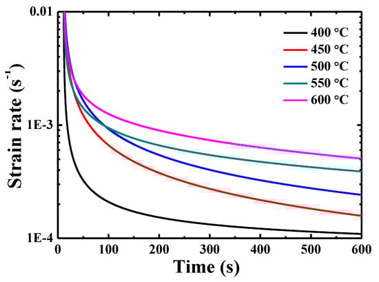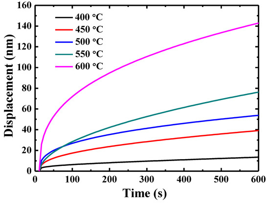 The representative creep displacement-holding time curves at different temperatures are shown in Figure 4. The indenter displacement increases dramatically at the beginning and then reaches a plateau when the testing temperature is 400 °C. In contrast, the creep curves for the testing temperature higher than 450 °C show an increasing trend, rather than a steady stage at the end of the creep curve.