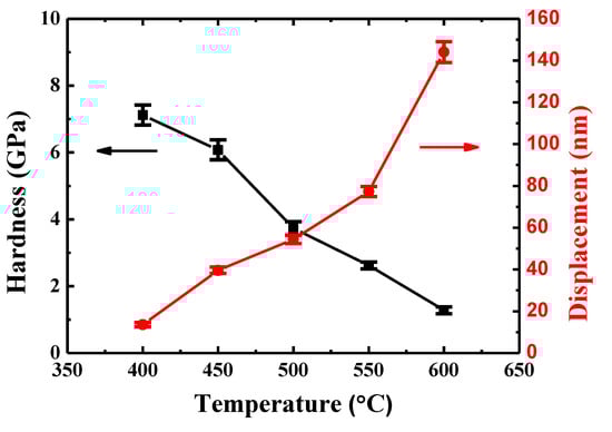 The creep displacements and hardness of {110} grains in TiAlV for a holding time of 600 s are given in Figure 5. It can be seen that the indenter displacement increases with temperature rising. More specifically, it was 13.6 nm at 400 °C and increased to 144.1 nm at 600 °C. The larger displacement at a higher temperature is expected because creep is a thermally-controlled process. The hardness of {110} grains in TiAlV almost maintains a constant value (~7.2 GPa) when the temperature increases from 27 to 400 °C, implying negligible creep deformation. Then, the hardness declines significantly, reaching a hardness of 1.3 GPa at 600 °C, which is in accord with the results of creep displacements.