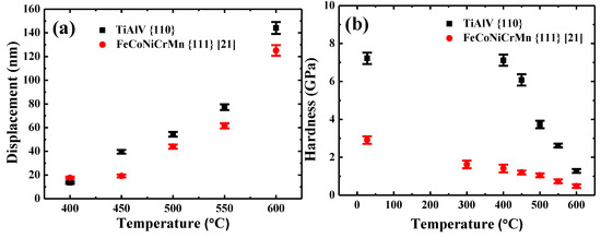 (a) The indenter displacement and (b) hardness of {110} grains in TiAlV LD-MEA and {111} grains in FeCoNiCrMn HEA [21] as a function of temperature.