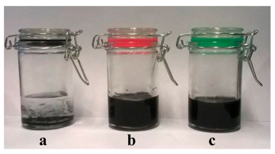 Water suspensions of all the HSAG-SP/CS adducts were observed to be stable for months at rest up to 5 mg/mL as HSAG–SP/CS content. They were stable also after centrifugation. Figure 3 shows water suspensions of HSAG (Figure 3a) and HSAG–SP/CS, with 1:1 as mass ratio and 1 mg/mL as concentration, after 1 month of storage (Figure 3b) and after 30 min centrifugation at 9000 rpm (Figure 3c).