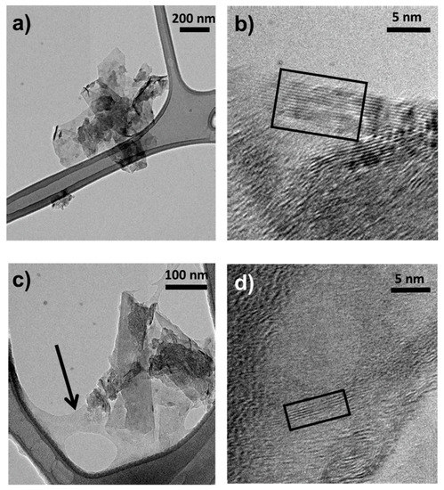 Micrographs at higher magnification (Figure 4b,d) show stacks of graphene layers disposed with a lateral side perpendicular to the beam (indicated in the boxes) from which it is possible to estimate the number of stacked graphene layers [11]. Stacks reported in Figure 4b,d were the most abundant ones in the examined micrographs. As evident in Figure 4b, most of the stacks obtained after sonication are made by about 12–15 graphene layers, a number only slightly lower than the one estimated through WAXD analysis. The centrifuged sample rather reveals stacks of about 4–5 layers (Figure 4d). These findings indicate that the energy given by the sonication process leads to the exfoliation of HSAG stacks and that centrifugation allows to isolate stacks made of few-layer graphene. These results, combined with the evidences from WAXD analysis (reported below in the text), which suggest prevailing disordered stacking of graphene layers, confirm that the combination of cationic CS and turbostratic nanosized graphite functionalized with SP can lead to the preparation of few-layer graphene. It has to be taken into account that only mild sonication was used to promote the exfoliation of the graphite nanoplatelets. It can be reasonably assumed that, by using methods with larger energy, more extended exfoliation could be obtained.