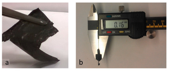 The simple casting of such HSAG–SP/CS water suspensions on a glass support led to the preparation of the carbon papers. Figure 6 shows that a free-standing paper 0.16 mm thick (Figure 6) was obtained by using 1:1 as HSAG–SP/CS ratio. This paper was very flexible, reaching a curvature radius close to zero. The density of the HSAG–SP/CS 1:1 paper was as low as 0.026 g cm−3.