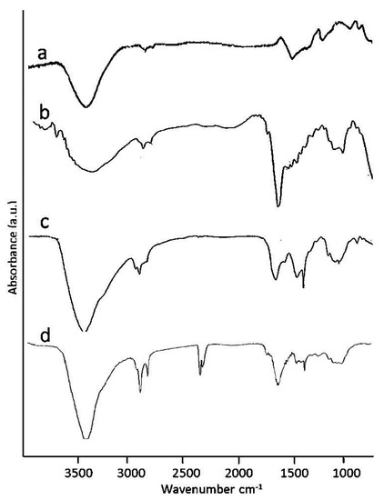 FT-IR spectra were recorded between 450 and 4000 cm−1 by using a FT-IR Spectrum One (Perkin Elmer, Waltham, MA, USA) equipped with a Universal ATR Sampling Accessory with a diamond crystal.