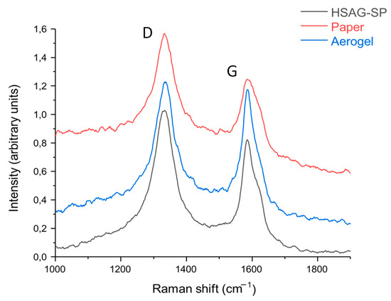 Raman spectroscopy was performed on the HSAG–SP adduct, HSAG–SP/CS 1:1 carbon paper and HSAG–SP/CS 1:1 aerogel. Raman spectra reported in Figure 8 have been obtained as average of four normalized spectra recorded in different points of the samples.
