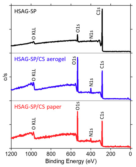 XPS analyses were performed on HSAG–SP and on HSAG–SP/CS 1:1 aerogel and paper. For all samples, wide scan spectra, reported in Figure 9, show three main signals: C1s, O1s and N1s, together with the presence of Si impurities at a BE below 200 eV. Table 1 details the atomic percent concentration of the samples and their relative concentration ratios among the different elements. Both HSAG–SP/CS aerogel and paper present a much higher content of nitrogen, compared to HSAG–SP, indicating that mainly chitosan is being detected during the XPS analysis. Table 1 also reports the theoretical relative amount of atoms in pure chitosan, as calculated taking into consideration the chemical formula [C6O4H9(NH2)x (NHCOCH3)y]r, where x and y are fractions of repeating units with free amine and acetylated amine, respectively. The chitosan used in this work has a deacetylation degree of 30%, and therefore x = 0.3 and y = 0.7. It appears that the atomic ratios measured for both HSAG–SP/CS aerogel and paper are very similar to the ones calculated for pure chitosan. Considering that XPS analyses probe only the outer layer of a sample (maximum ca. 100 Å), these results suggest that CS is at the surface of both the aerogel and carbon paper and covers HSAG–SP.