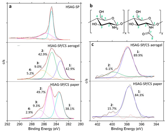 High-resolution C1s XPS spectrum and its deconvolution for HSAG–SP, HSAG–SP/CS 1:1 aerogel and HSAG–SP/CS 1:1 paper (a), schematic representation of the chemical structure of partially deacetylated chitosan and labeling of C atoms (b), high-resolution N1s XPS spectrum and its deconvolution for HSAG-SP/CS 1:1 aerogel and paper (c).