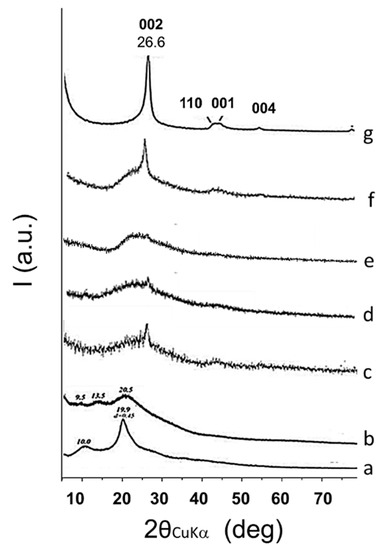 The two reflections at 10.0° and 19.9° as 2θ angles demonstrate the CS crystallinity (Figure 11a). The pattern of an isolated film of CS treated with acetic acid (in the absence of HSAG) in Figure 11b reveals crystalline peaks at 20.5° and 11.8° as the 2θ value. The WAXD pattern of HSAG–SP (Figure 11g) shows (00ℓ) reflections that indicate the order in the direction orthogonal to structural layers: (002) at 26.6°, which corresponds to an interlayer distance of 0.338 nm, and (004) at 54.3°. The in-plane order is proven by the (100) and (110) reflections at 42.5° and 77.6°, respectively. By using (002) reflection and applying the Scherrer equation (Equation (1)), the out of plane correlation length (D┴) was calculated and about 29 stacked layers were estimated.