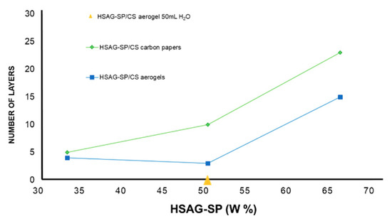 In the graph of Figure 12, the number of stacked graphene layers, evaluated by peak shape analysis of (002) reflection in WAXD spectra, is plotted as a function of the relative amount of HSAG–SP in the composite.