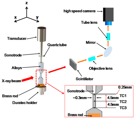 A Sn-30wt%Cu alloy was chosen as the experimental alloy. It has a wide solidification range, allowing ultrasound to be applied over a wide range of temperatures (from 250 to 750 °C). Furthermore, the Sn–Cu binary system [25] is the key alloy system for lead-free soldering materials, and intermetallic compounds such as Cu6Sn5 are promising candidates for enhancing the storage capacity of Lithium ion-based batteries. Samples were contained inside specially made quartz capsules with a flattened “hourglass” shape, as shown in Figure 1. The thin central window section of the capsule was 300 µm thick to allow good X-ray penetration. The sonotrode was positioned in the upper end of the hourglass, with the tip close to the top of the thin section. A heat sink made of a stainless steel rod was placed at the bottom reservoir of the hourglass capsule to create a thermal gradient. The alloy in the capsule was melted inside a small cartridge heater furnace [26]. Sample temperature was monitored and recorded by three K-type thermocouples placed at the top, middle and bottom of the thin window section. The details of the experiment are very similar to those described in [22,24].
