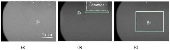 X-ray images of liquid Sn-30wt%Cu alloy, without the application of ultrasound, (a) a typical flat-field image, and the black regions at the corners of the images are from the lens mount of the camera. (b) in the chaotic cavitation region with the sonotrode (marked with the white dotted line) in the view field; (c) in the quasi static cavitation region, i.e., 1.5 mm below the sonotrode. g0, g1 and g2 mark the locations (including the grey level) where the thicknesses of the liquid metal are known as listed in Table 1.