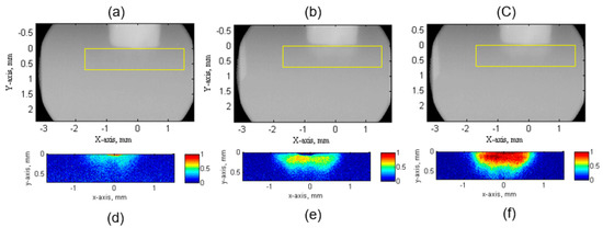 The ultrasound bubble clouds observed in the CCR, at different ultrasound powers (20 W, 60 W and 100 W, respectively) are illustrated in Figure 4. In each case, 10 sequential X-ray images were averaged to reduce background noise, so that each result in the figure contained the information averaged over 5 ms. Figure 4d–f, shows the bubble volume fraction calculated using Equation (3).