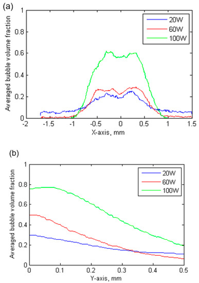 The averaged bubble volume fraction in (a) horizontal direction from position −1.5 mm to 1.5 mm (X-axis), to show bubble volume fraction distribution in horizontal direction; in (b) vertical direction from sonotrode tip to 0.5 mm (Y-axis), to show bubble volume fraction distribution in vertical direction.