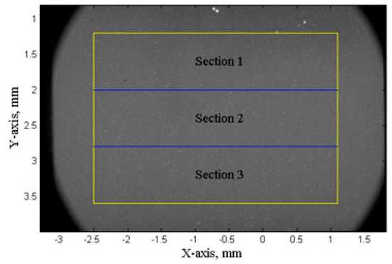 In the SCR, individual bubbles were observed and hence tracking and counting of the imaged bubbles are possible. MATLAB was employed to track and measure bubble sizes and velocities. The region of interest for the measurement is shown by the yellow box in Figure 6. The region of interest was further divided into three sub regions: Section 1 (1.2 mm to 2 mm, distance to sonotrode), Section 2 (2 mm to 2.8 mm, distance to sonotrode), Section 3 (2.8 mm to 3.6 mm, distance to sonotrode). A statistical study of bubbles was performed on a sequence of 2000 X-ray images (1 s duration of ultrasound processing) acquired in a quasi steady-state condition (1 s after the ultrasound was turned on, and a steady-state condition was established in the liquid alloy).