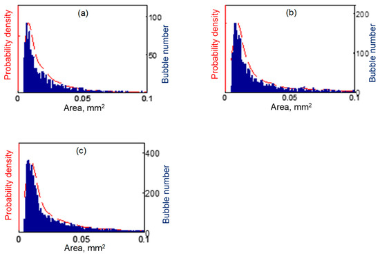 Figure 7 shows the bubble size distribution for different ultrasound powers. The Kernel probability density function [30] was used to calculate the probability densities of these bubble size distributions. The maximum probability density occurred at a bubble size of 0.0078 mm2, 0.0098 mm2 and 0.0096 mm2 (in Table 3) for 20 W, 60 W and 100 W ultrasonic powers, respectively. These results indicate that bubbles with a diameter of approximately 0.01 mm2 were dominant in the bubble population. The observed bubble size was mainly dependent on two factors: (1) the initial bubble radius (i.e., the nuclei size), which is related to the liquid properties (viscosity, density, etc.) and (2) ultrasound pressure magnitude and frequency. It should note that the camera resolution is 4 µm per pixel, which means that a bubble diameter smaller than 10 µm cannot be resolved.