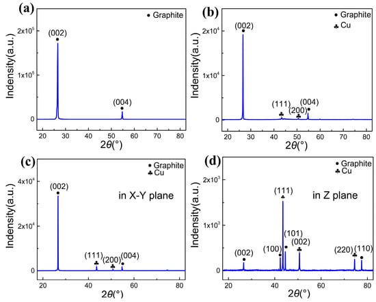 XRD patterns of (a) raw GFs, (b) coated GFs, (c) coated GFs/Cu composites in X–Y plane, and (d) coated GFs/Cu composites in Z plane.