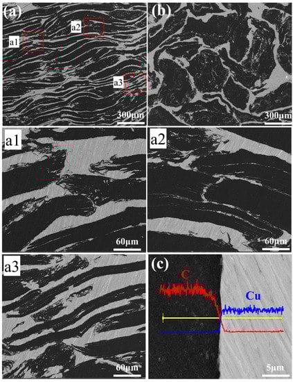 Figure 4a,b shows the typical side-view (in Z plane, X–Z or Y–Z plane) and top-view (in X–Y plane) morphology of 70 vol% GFs/Cu composite. The dark region represents GFs while the light region represents the Cu matrix. As is shown in Figure 2d, the GFs were covering the surface of others in a certain area before the hot pressing process, which provided the possibility of long size continuous GFs. The size of the continuous dark region is much more than 500 μm, which is the average size of GFs in Figure 4a. The edges of GFs partly coincided with surroundings in Figure 4b, corresponding to Figure 2d. All these indicate that the single GF had connected with others to a certain degree, which is beneficial for forming high TC channels and improves the TC of the composite in the X–Y plane. In order to explore the forms of continuous GFs, the high-magnification of corresponding regions in Figure 4a were provided in Figure 4a1–a3. Some GFs contacted with others by edges, which may cause bending deformation in Figure 4a1. Some GFs were clamped by pieces of GFs in Z plane direction and connected edges by the other GFs in the X–Y plane direction without edge deformation in Figure 4a2. The other GFs overlapped with each other, with about half of the surface area in Figure 4a3. Those connection ways contribute to the forming of a highly thermal network of GFs/Cu composites in the basis of the GFs. It also can be found that the GFs network was well packaged by Cu matrix in Figure 4a,b. It might be that the Cu foil was in a semi-melted state at 1040 °C and the semi-melted Cu filled in the pores of the GFs network under 40 MPa pressure. Figure 4c shows the interfacial micro-structure and EDS line-scan analysis of GFs and Cu matrix. The element analysis showed a high diffraction peak of C and low diffraction peak of Cu in the graphite phase, as is reversed in the Cu matrix. There was an excessive boundary of C-Cu interface but no porosity or defects had been detected. Owing to the Cu coating on the surface of GFs, the GFs were not directly connected with each other. Cu coating on the surface of GFs provided transition area for the combination of GFs–Cu and GFs-GFs.