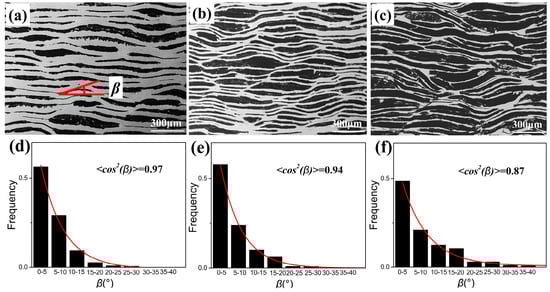 (a–c) SEM images of GFs/Cu composites in Z plane as the volume fraction of GFs is 30%, 50% and 70%, respectively; (d–f) Corresponding frequency analysis of β and function fitting of ρ(β).