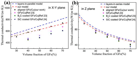 The thermal conductivity of GFs/Cu composites (a) in X–Y plane, (b) in Z plane.