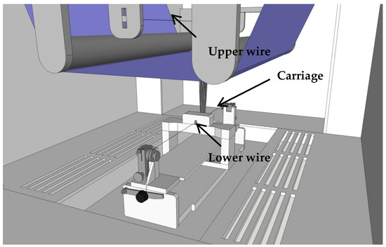 Nanofiber mats were created by electrospinning in a “Nanospider Lab” (Elmarco Ltd., Liberec, Czech Republic), using a wire-based technology. The setup is shown in Figure 1. The carriage contains the spinning solution which flows through a spinning nozzle. In this way the lower wire is coated with polymer solution. Since a large positive voltage is applied to the lower wire, while the upper wire is grounded, a strong electric field is created in the spinning area which is usually strongest in the middle, between the two wires. Along the edges of the blue-marked substrate, the electric field becomes non-uniform, resulting often in partly aligned nanofibers which can be recognized if the substrate is not moved during the experiments, as done here.