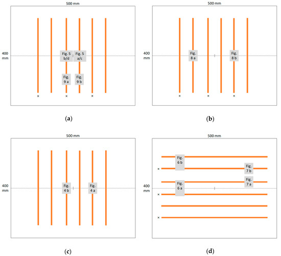 Overview of sample positions (x marks the grounded copper tapes, the dotted line marks the spinning wires): (a) PAN/magnetite spun for 10 min; (b) PAN/magnetite spun for 5 min; (c) pure PAN spun for 10 min; (d) PAN/magnetite spun for 10 min.