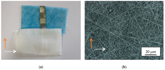 Non-magnetic reference nanofiber mat, electrospun partly on a conductive copper tape. (a) Photographic image; (b) confocal laser-scanning microscope (CLSM) image. The orange arrow marks the copper tape orientation, the white dotted arrow the spinning wire orientation.