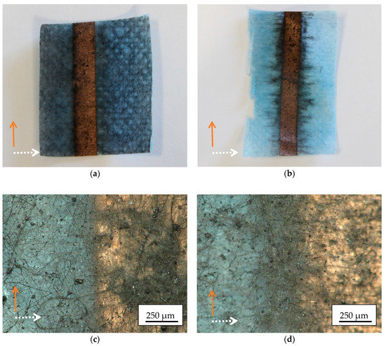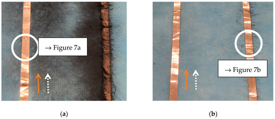 Next, Figure 6 shows photographic images of the nanofiber mats, taken in the middle (Figure 6a) or at the border of the electrospinning area (Figure 6b), electrospun on not grounded (left strip in each image) or grounded copper tapes (right strip in each image) which are oriented parallel to the spinning wires. In Figure 6a, the grounded wire of the Nanospider Lab is positioned in the middle between the tapes visible here.