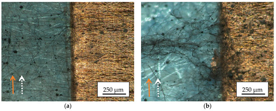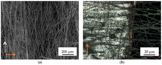 The results of the next experiment with a reduced amount of nanofibers are presented in Figure 8. For this purpose, electrospinning was carried out for only 5 min (instead of 10 min before). Images taken along the borders of the spinning area reveal indeed a fiber orientation perpendicular to the copper tape, especially in case of the not grounded tape on which fewer nanofibers are positioned (Figure 8a).