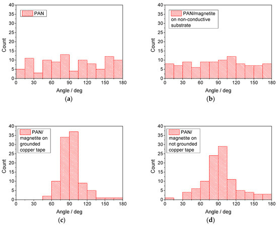 Here, the PAN/magnetite nanofiber mat electrospun on a non-conductive substrate shows a clearly isotropic angle distribution (Figure 11b). PAN/magnetite on the not grounded substrate (Figure 11d) shows a clear anisotropy with a favored orientation around 90° with respect to the copper tape, i.e., perpendicular to its borders. This behavior is even stronger for the PAN/nanofiber mat spun on the grounded copper tape (Figure 11c). It must be mentioned, however, that the pure PAN nanofiber mat, electrospun on the copper tape, shows no fully isotropic angle distribution, but may indicate some favored orientations. This finding—which is not the main topic of this paper—will be investigated in the future.