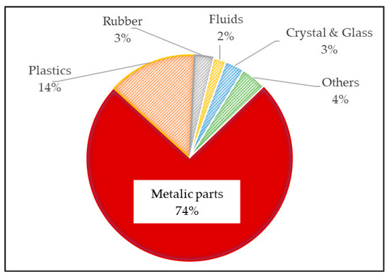 The lightness of plastics, in addition to weight reduction, allows systems and components to be made more sophisticated and cheaper than with steels. In Figure 2, provided by the European Association of Automobile Manufacturers (A) [5], it can be seen that—thanks to the implantation of plastics—the energy consumed during its manufacture is lower.