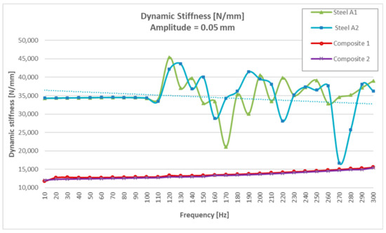 Dynamic stiffness results of CFRTP and steel, between 10 Hz and 300 Hz, at 0.05 mm.