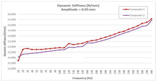 Analyzing the results of Table 2 and Table 3, it could be seen that steel, at equal thickness and volume, was much more rigid than CFRTP material and that this was not significantly influenced by being subjected to different frequencies and amplitudes of resonance. The dynamic rigidity of steel was around 33,000 N/mm compared to 12,000 N/mm of the two CFRTPs, (Composite 1 and Composite 2).