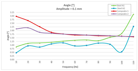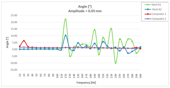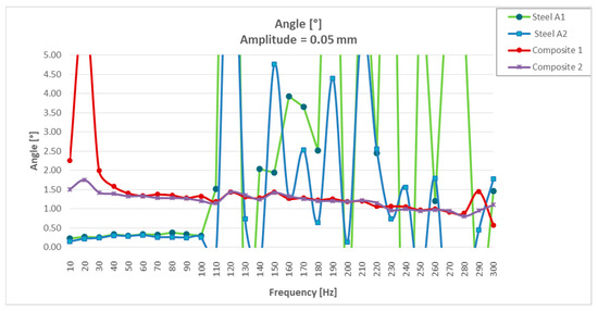 The angle/frequency results obtained in CFRTP and steel test specimens from 0 to 300 Hz are shown in Figure 11. It was observed how the CFRTP remained stable throughout the working range, while the steel resonated from 100 Hz, producing uncontrolled undulations in the dynamic stiffness graphs, as well as in the dynamic angle graphs.