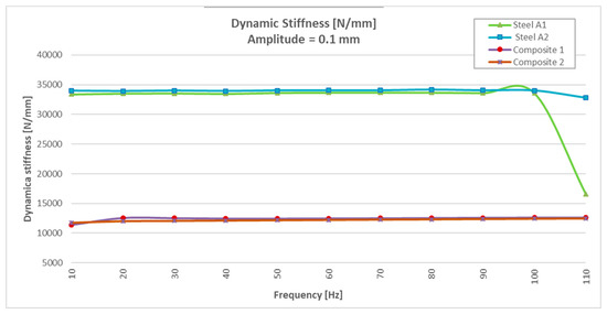 Dynamic stiffness results of CFRTP and steel, between 10 Hz and 110 Hz, at 0.1 mm.
