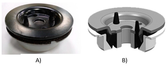 To solve this problem, the authors have opened a parallel research line, (not included in this article), on the feasibility of CFRTP in fasteners, formed by an upper and a lower part of composite reinforced with continuous fiber, joined together by ultrasonic welding with an internal reinforcement between both sheets of the panel type. A component of the car, an anti-vibration differential gear assembly, made of steel and vulcanized rubber, is shown in Figure 15, as well as an experimental prototype made of CFRTP and vulcanized rubber.