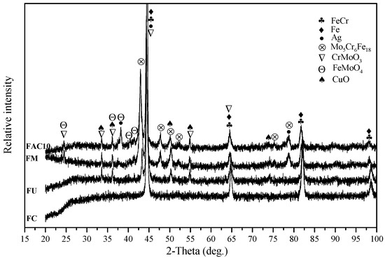 According to the XRD pattern, the peaks of CuO are obvious, indicating that the CuO showed a high stability in the composites. Silver was present in its simple substance phase in the matrix. For FAC6, FAC10, and FAC14, the main phases consisted of Fe, FeCr, CrMoO3, FeMoO4, Mo5Cr6Fe18, CuO, and Ag.