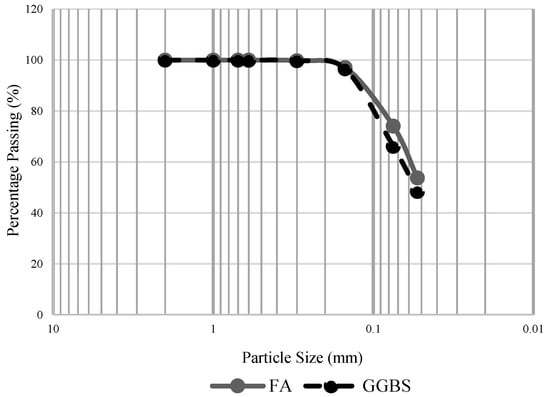 Particle size distribution of FA and GGBS.