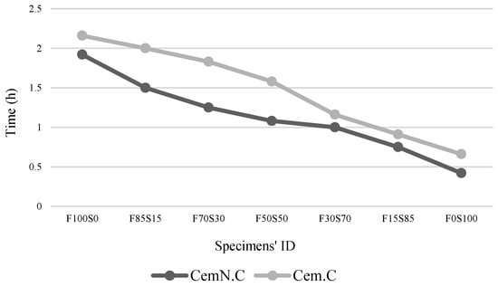 The reduction in the final setting time is also observed with an increase in the GGBS content. The Cem.C paste containing 100% FA and 0% GGBS (F100S0) required a prolonged setting time of 2.16 h. This time tends to reduce as the amount of GGBS increases in the paste. Thus, with 0% FA and 100% GGBS (F0S100), the final setting time of the paste was observed to be 0.66 h. A similar trend was noted for CemN.C pastes, where the setting time of the F100S0 paste was 1.92 h and 0.42 h was noted for the F0S100 paste, which is comparatively lower than those for NaOH-activated pastes. The effects of increasing GGBS on decelerating setting times can be described in terms of increasing reactive Ca content from the GGBS source in the mixture, leading to the quick setting time [14]. Although FA contains 18.72% Ca was used to synthesis the pastes, based on this, the setting time values should have increased gradually for the pastes with increasing fly ash, but the results indicating the abrupt increase of setting time with increasing fly ash content. Hanjitsuwan, Hunpratub [9] suggests that the leaching of Ca content in the mixture reduces the setting time compared to the mixture where leaching of Ca was interrupted. This indicates that the Ca from fly ash was not/partially leached, but the Ca from the GGBS source leached completely; as a result, the setting time increased with increasing fly ash. The GGBS is more reactive than is fly ash, which was also observed in the previous studies [20,34]. Furthermore, the reactivity of fly ash accelerated when activated in NaOH + Na2SiO3 solution. As seen in the results, the fly ash-dominated paste, i.e., sample F100S0 when activated in NaOH + Na2SiO3, the setting time observed at 0.42 h., while for the same sample when activated in NaOH solution, the setting time prolonged to 0.24 h. and thus observed to be 0.66 h.