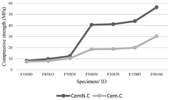 The results of the compressive strength of FA and GGBS geopolymer mortar synthesized in two different alkalis (Cem.C and CemN.C) are presented in Figure 3. From the graphs, the compressive strength of the Cem.C samples is comparatively lower than that of CemN.C. This is due to the additional silica in the mixture supplied from Na2SiO3 source present in CemN.C samples as it increases SiO2 content in the pastes [4,5]. With its addition, the structure forms with close-packed anions, leading to the crossed-linked structure, and thus improves the compressive strength [5,38].