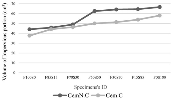 Figure 4 and Figure 5a,b show the impervious portion, apparent porosity, and water absorption respectively of samples of various FA to GGBS ratios of both Cem.C and CemN.C series. As seen in Figure 4, the CemN.C samples comparatively obtained the highest impervious portion (i.e., 44.05 cm3 with 0% GGBS and 66.66 cm3 with 100% GGBS) than Cem.C samples (i.e., 37.6 cm3 with 0% GGBS and 58.025 cm3 with 100% GGBS) indicating CemN.C sample are more impervious than Cem.C samples. Results revealed the impervious portion is in agreement with the result of apparent porosity, Figure 5a and water absorption, Figure 5b where the CemN.C series compared to the Cem.C obtained the low porosity (i.e., 40.05% with 0% GGBS and 10.14% with 100% GGBS) and low water absorption (i.e., 15.07% with 0% GGBS and 3.8% with 100% GGBS). For the Cem.C series the porosity and water absorption observed with 0% GGBS is 42.62% and 17.49%, respectively and the porosity and water absorption with 100% GGBS observed was 16.12% and 5.28%, respectively. This confirms that the addition of Na2SiO3 increased the soluble silicates within the matrix, which improved the inter-particle bonding and made the matrix less porous, resulting in improved strength compared to NaOH [40]. The results in Figure 4 show the increasing trend in volume of impervious portion as the content of GGBS increased from 0% to 100%. The trend shown in the impervious portion was the inverse of the apparent porosity of Figure 5a and water absorption, and Figure 5b indicated the decrease in open pores with the increasing GGBS content, which prevented the water from penetration.