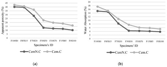 Cem.C and CemN.C activated FA/GGBS samples: (a) apparent porosity; (b) water absorption.
