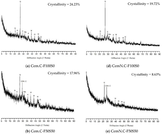 With the incorporation of the GGBS, the reduction in the intensity of the crystalline peaks, as well as in percentage of crystallinity was observed in the F50S50 pattern of both Cem.C, Figure 7b and CemN.C, Figure 7e samples. The Cem.C F50S50 was composed of the same crystal phases as those of Cem.C F100S0 but with reduced intensity and with 17.96% crystallinity. It is worth observing that the calcite peak around 2θ = 28° showed traces of C-S-H gel, indicating the formation of C-S-H gel with the addition of reactive Ca from GGBS source. Additionally, with the incorporation of GGBS, the intensity of the hydrosodalite peak reduced. This was caused by the increase in CaO content in the mix as the fly ash was partially replaced by the GGBS. The reduction of hydrosodalite peak intensity was a clear indication of the development of N-A-S-H gel, which is responsible for improved strength. Phoo-ngernkham, Maegawa [4] and Qiu, Zhao [20] also showed the similar trend for a sample consisting of class-F FA /GGBS in a 50/50 ratio. Comparatively, the pattern of CemN.C F50S50, Figure 7e, exhibited the peaks corresponding to quartz, calcite with traces of C-S-H, mullites, and arghonite, but with reduced intensity and reduced crystallinity, i.e., 8.63%. No formation of hydrosodalite was observed in this pattern; thus, the strength improved compared to that of Cem.C F50S50. This was mainly due to the coexistence of C-S-H and N-A-S-H gel [39]. Apart from the crystalline peaks, the intensity of the hump also increased for the samples F50S50 compared to those for F100S0, indicating the increase in the formation of amorphous phases supplied from the GGBS source. However, hump intensity of the sample Cem.C F50S50 was comparatively lower than that of CemN.C F50S50, as observed at 2θ = 25°–38°.