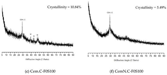 For sample Cem.C F0S100, as shown in Figure 7c, the XRD pattern was mainly composed of amorphous phases as it is clear from the reduced crystallinity percentage, i.e., from 17.96% to 10.84% with fewer diffraction peaks of mullite, aragonite, and calcite with traces of CSH gel. The intensity of calcite, C-S-H, peak around 2θ = 29° was comparatively stronger than those seen in the F50S50 pattern, indicating the increase in CaO, leading to the formation of calcite and C-S-H gel, which was solely responsible for the reduced setting time to 0.66 h, increased strength of 30.34 MPa, and reduction of porosity to 16.12% [4,20]. CemN.C F0S100, Figure 7f, on the other hand, showed the lowest crystallinity of 5.49% with only crystalline peaks of calcite and C-S-H gel. The broad hump at 2θ = 23.5°–38° indicates the main composition of amorphous phases incorporated from both GGBS and Na2SiO3, leading to the lowest setting time of 0.42 h, the highest compressive strength of 56.43 MPa, and lowest porosity of 10.14%.