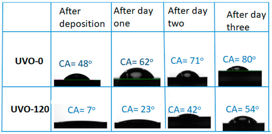 Images of the water contact angle (CA) measurements for both treated (UVO-120) and untreated (UVO-O) ZrOx thin film and their corresponding contact angles after aging for three days.